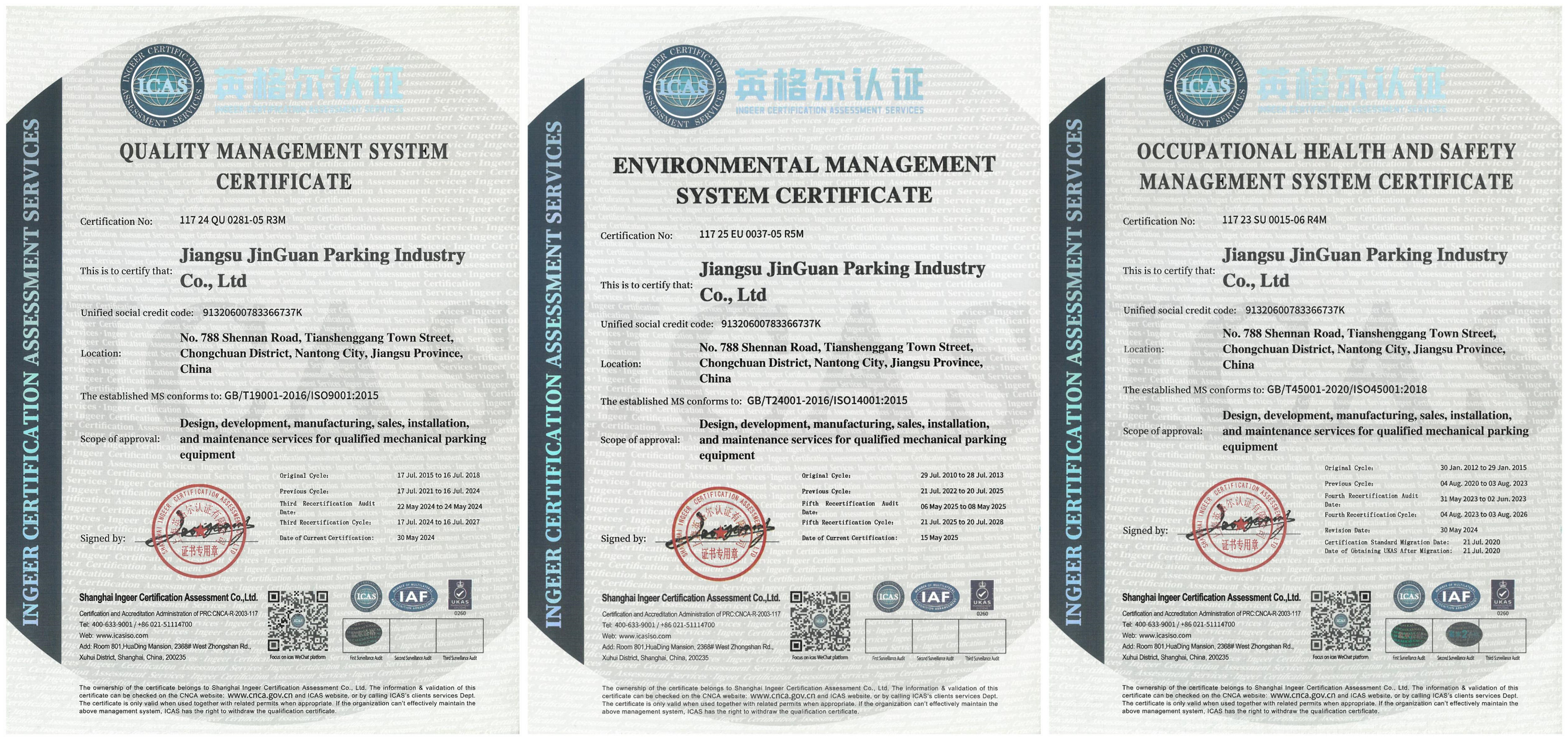 Jinguan hat mear as 200 meiwurkers, hast 20000 kante meter oan workshops en grutskalige searjes fan masine-apparatuer, mei in modern ûntwikkelingssysteem en in folsleine set testynstruminten. Mei mear as 15 jier skiednis binne de projekten fan ús bedriuw wiidferspraat yn 66 stêden yn Sina en mear as 10 lannen lykas de Feriene Steaten, ThEilân, Japan, Nij-Seelân, Súd-Korea, Ruslân en Yndia. Wy hawwe 3000 parkearplakken levere foar parkearprojekten, ús produkten binne goed ûntfongen troch klanten.